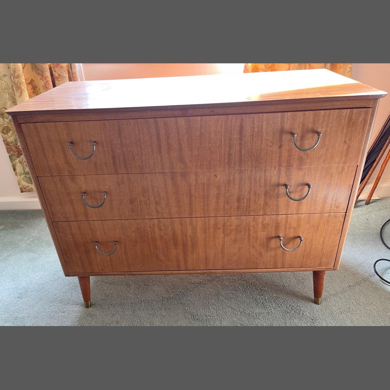 A retro 1960's three drawer chest of drawers with original handles supported on four tapered legs with brass collars