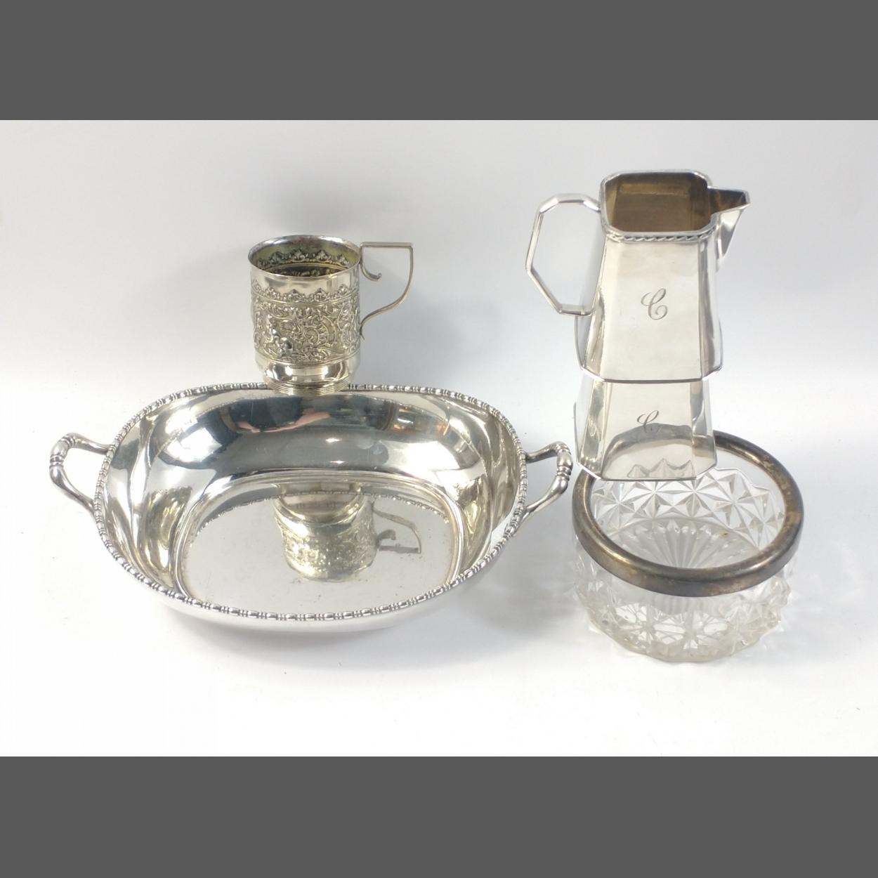 A small selection of SILVER PLATE items to include a twin handled dish 26cm handle to handle , a small embossed mug , a cut glass bowl with EP rim and a cream jug with matching sugar bowl