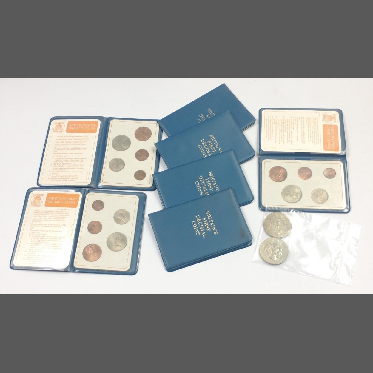Seven sets of Britain's FIRST DECIMAL COINS and two modern Crown coins one dated 1977 and the other 1981