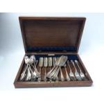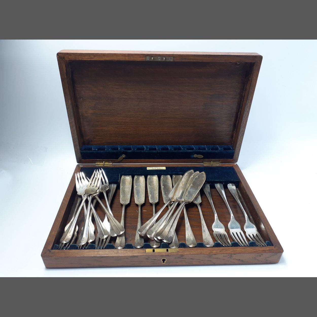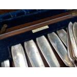 A nice antique cutlery box with retailers label for HARDY & Co Princes Street Edinburgh which contains possibly mismatch EPNS knives and forks as they do not fully fit to the box. comprises 12 forks and 11 knives. Box measures 38 x 25cm