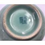 A Chinese celadon bowl (15cm dia) with an embossed design of carp, with four characters signature to base