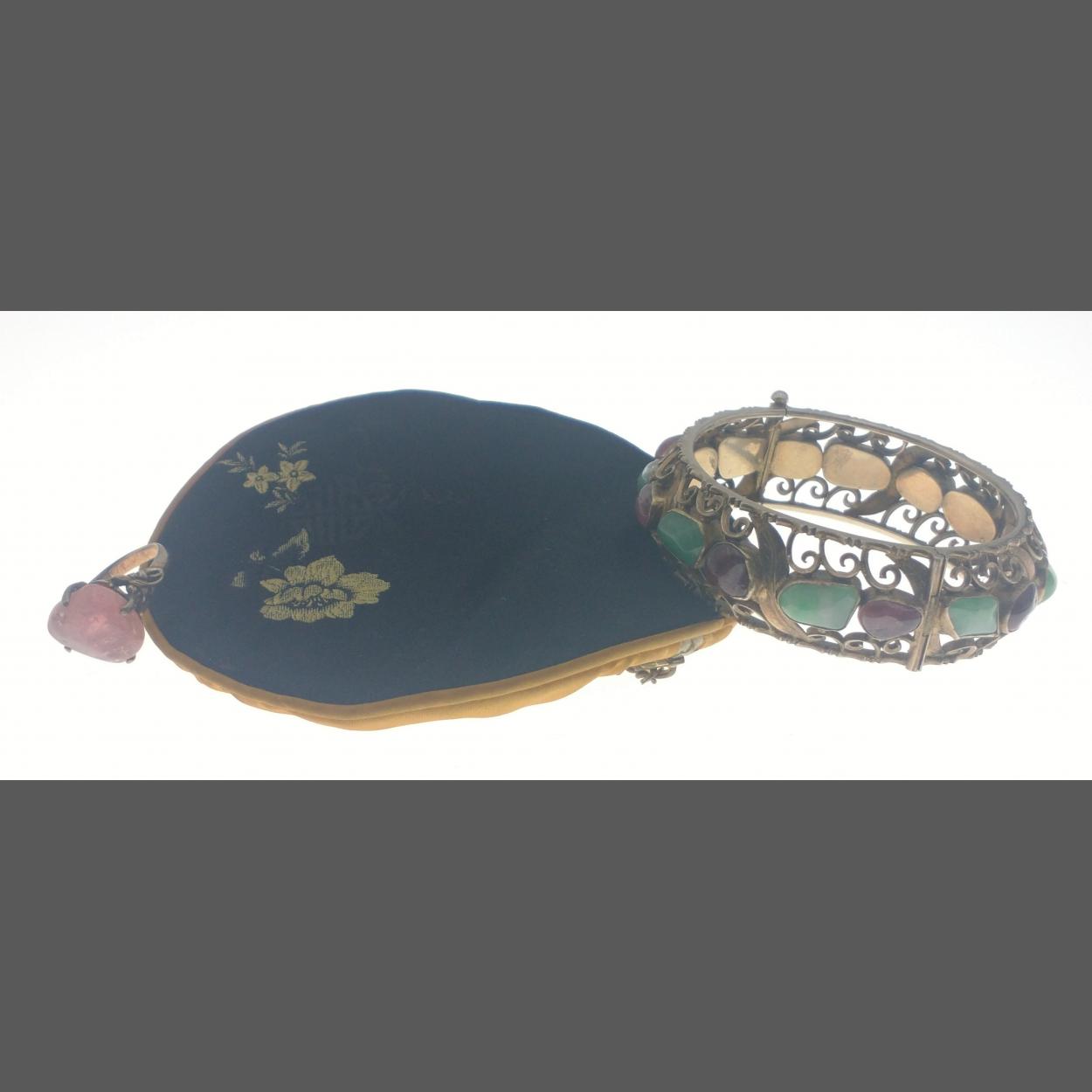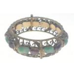 A bangle, stamped silver, diameter approx 6.5cm set with green and pink stones, also an adjustable size ring, stamped silver, with a pink stone approx 1.5cm long