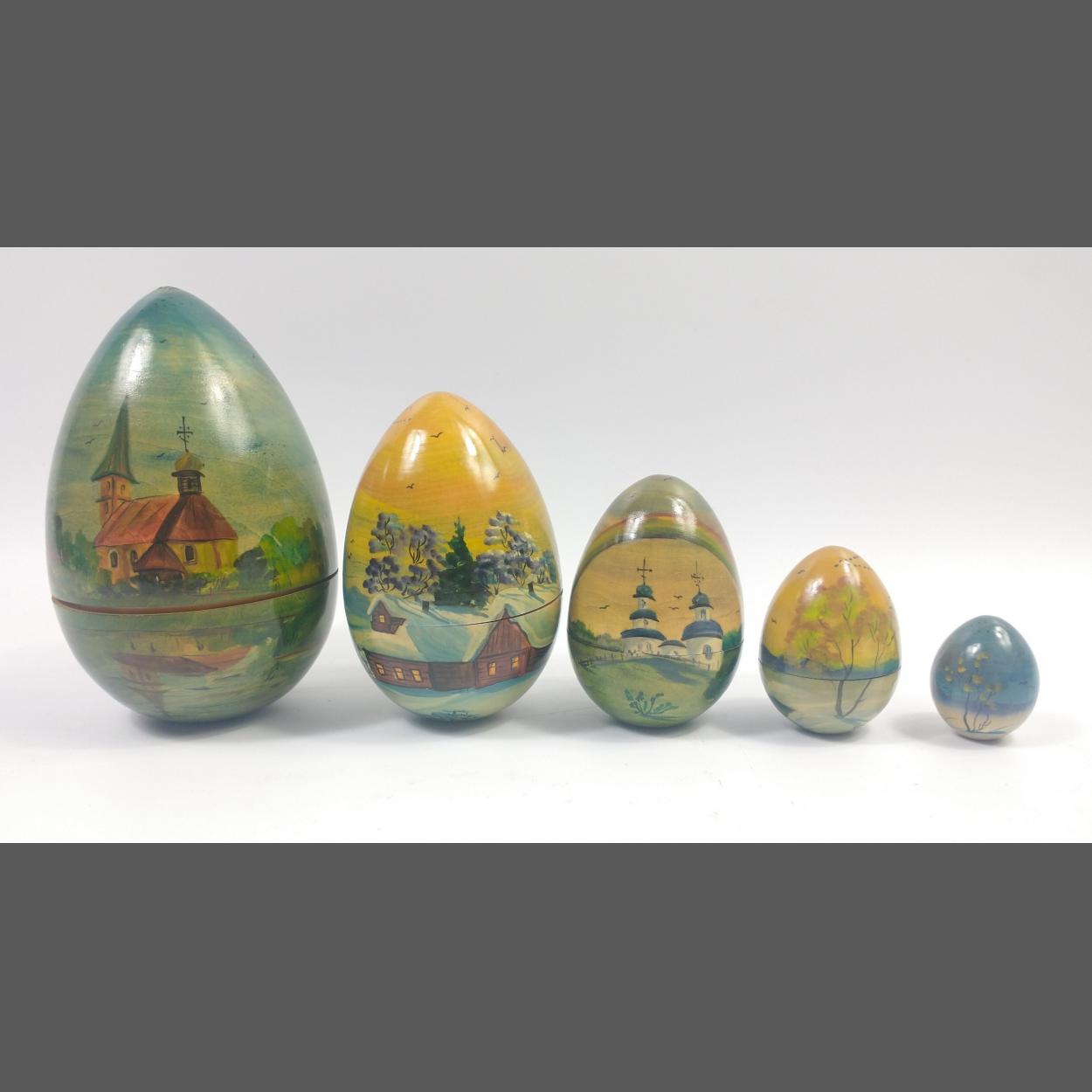 A set of 5 stacking wooden eggs with a pastoral scenes