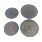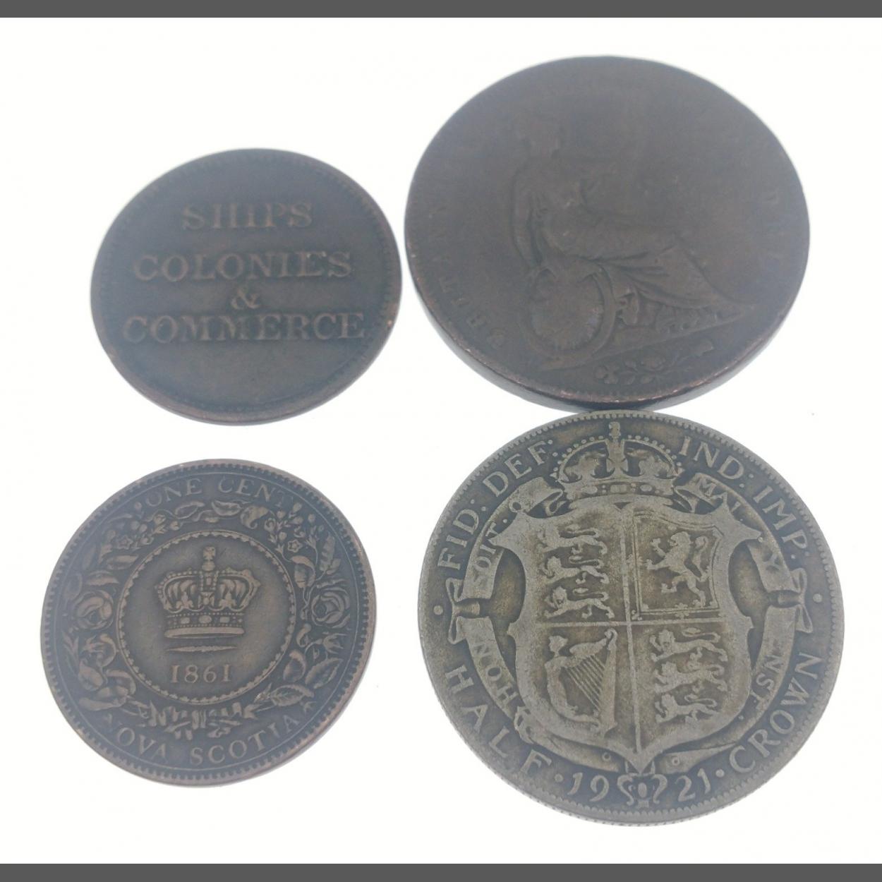 An interesting small group of collectible coins to include 1921 half crown with wear, 1853 Young Head Penny with wear, an 1861 Nova Scotia young head one cent and an unusual Canadian trade token SHIPS COLONIES & COMMERCE. Nice group.