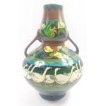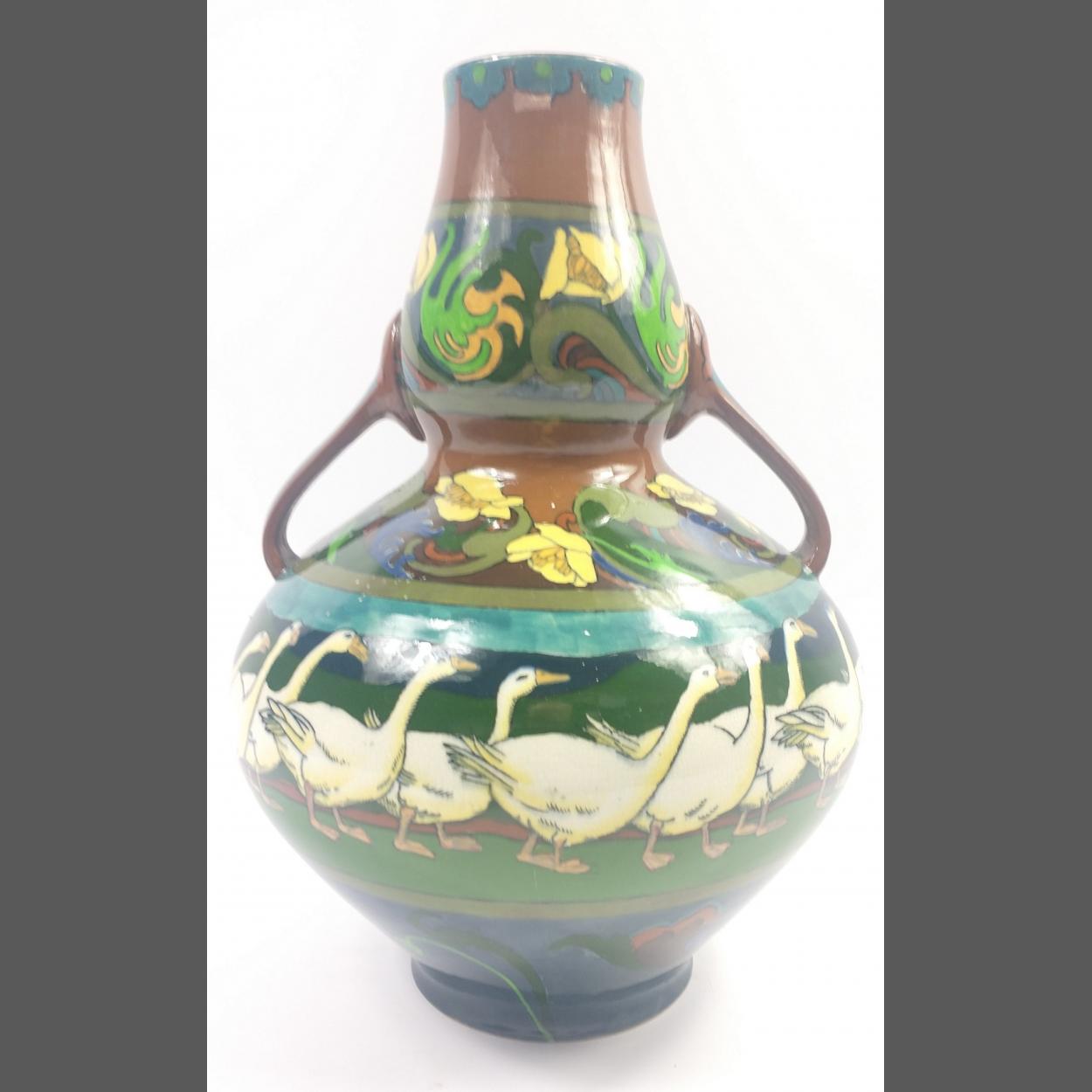 A Wileman & Co Foley INTARSIO No 3084 vase with design of geese marching around the centre, has a small chip to the rim, stands 30cm approx