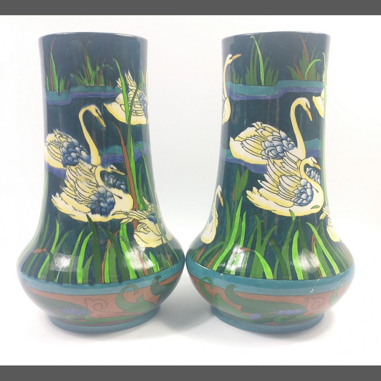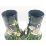 A pair of Wileman & Co Foley INTARSIO No 3159 vases decorated with gracefully swimming swans, each stands 31cm high, no signs of damage