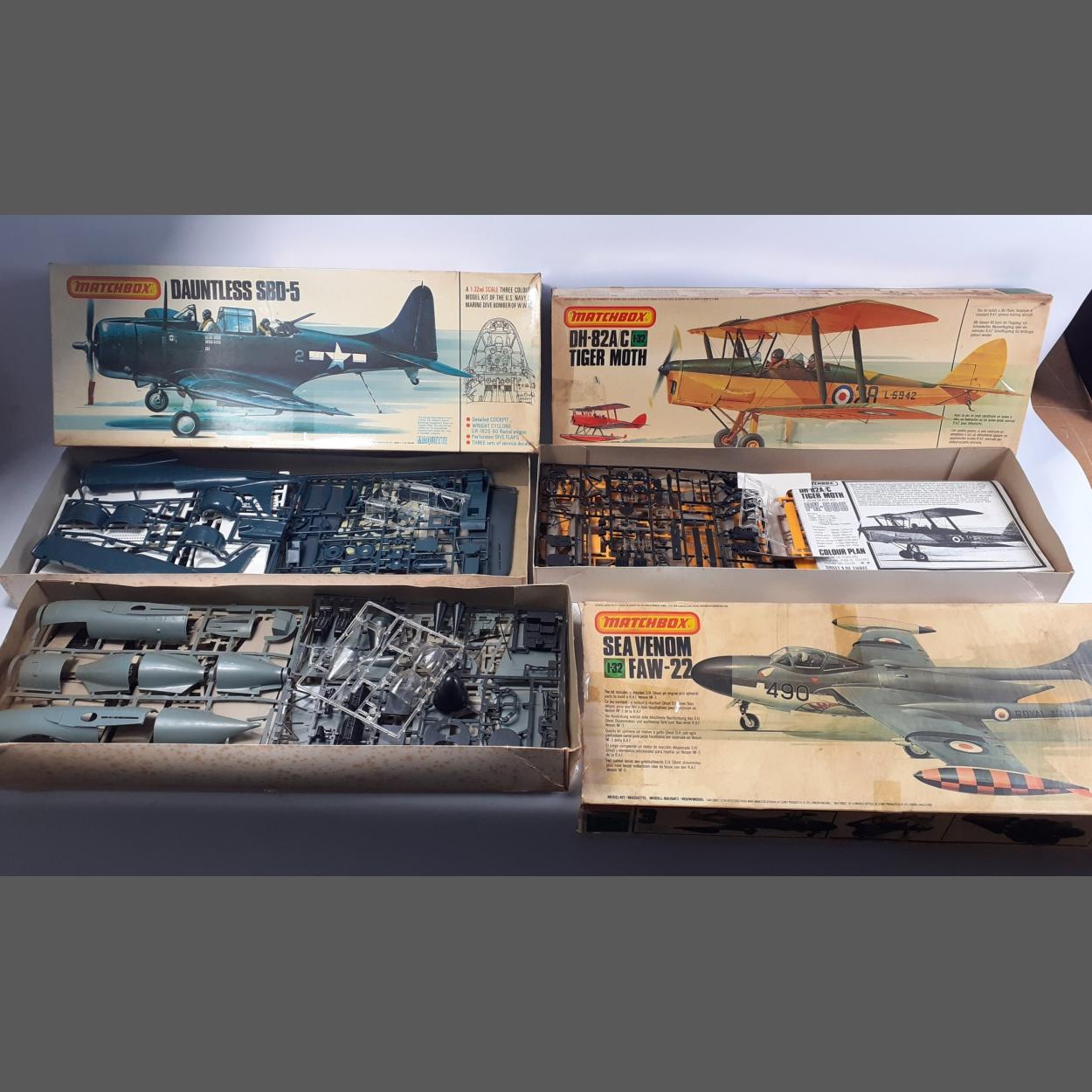 MATCHBOX 1/32 Model Kits x3 including DH82A TIGER MOTH, SEA VENOM FAW-22, PK-503 DOUGLAS DAUNTLESS. All kits from the late1970's unbuilt but opened, appears complete. Boxes are in fairly poor condition from long term storage