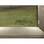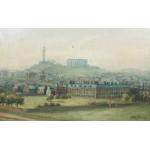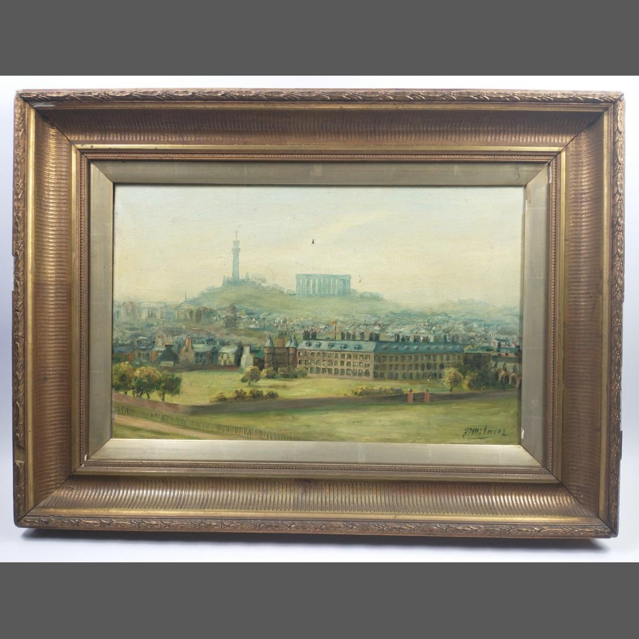 An antique oil on canvas depicting Holyrood House with Calton hill in the background, with a signature, possibly 'Milne 12', frame measures 75x54cm approx, there is a small hole in the canvas and some pieces of the gesso frame missing