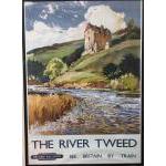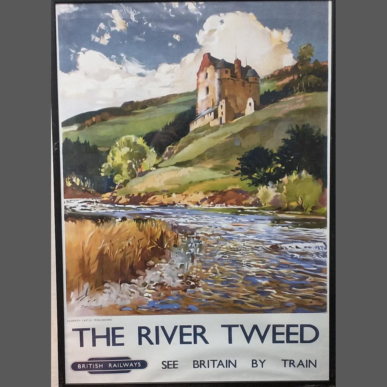 LOCAL PEEBLES VINTAGE RAILWAY INTEREST - A large framed poster showing 'The River Tweed Neidpath - original artwork was by Jack Merriott - dimensions 97cm height x 70cm width - all set within a nice glazed frame with black border - what a nice Xmas gift for someone special!
