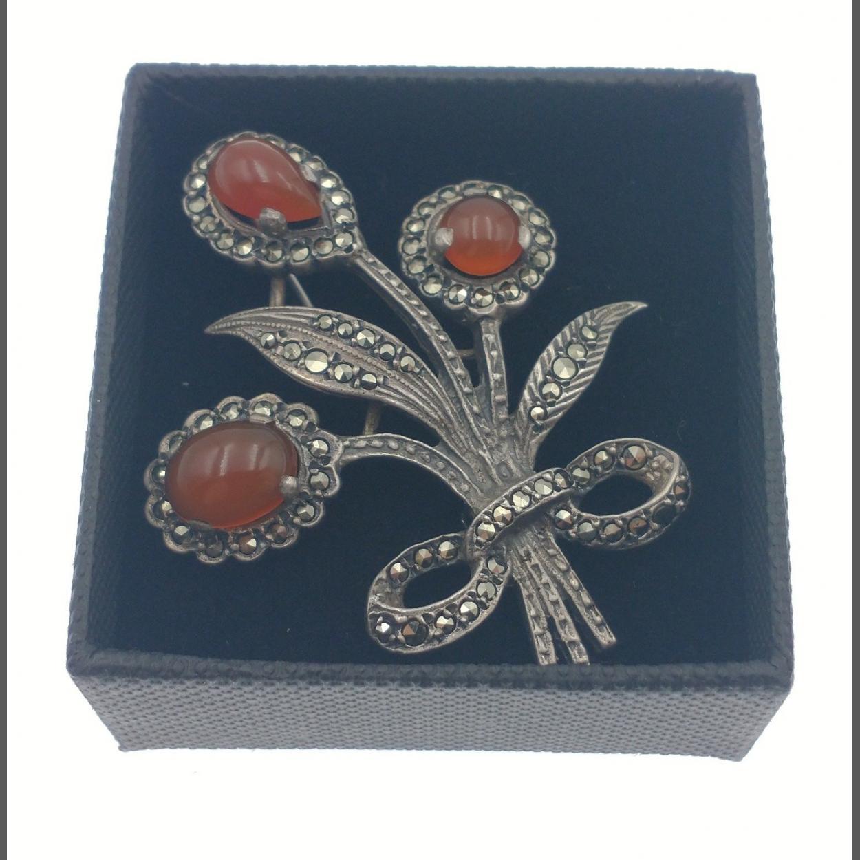A PRETTY silver hallmarked (Birmingham) marcasite brooch set with amber coloured stones approx 5cm long, gross weight 11.2g