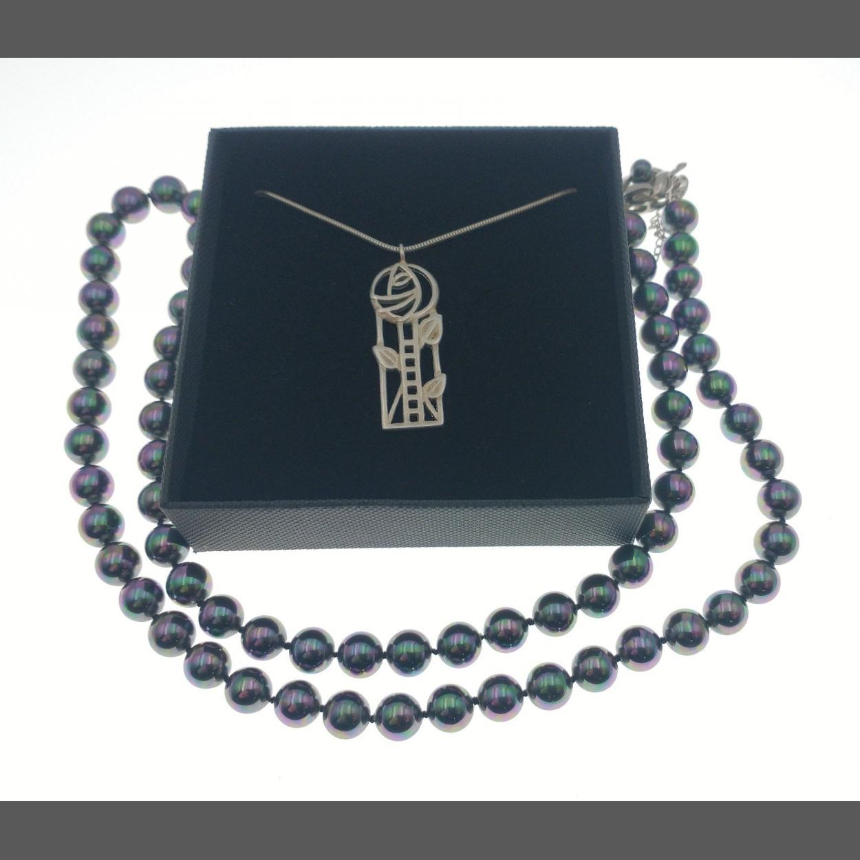 A silver plated Rennie Mackintosh style pendant 4cm long on a 925 stamped chain approx 42cm long, chain weight 3.57g, plus a string of iridescent beads approx 50cm long with 1 925 stamped clasp