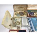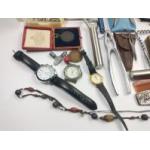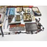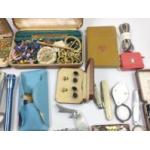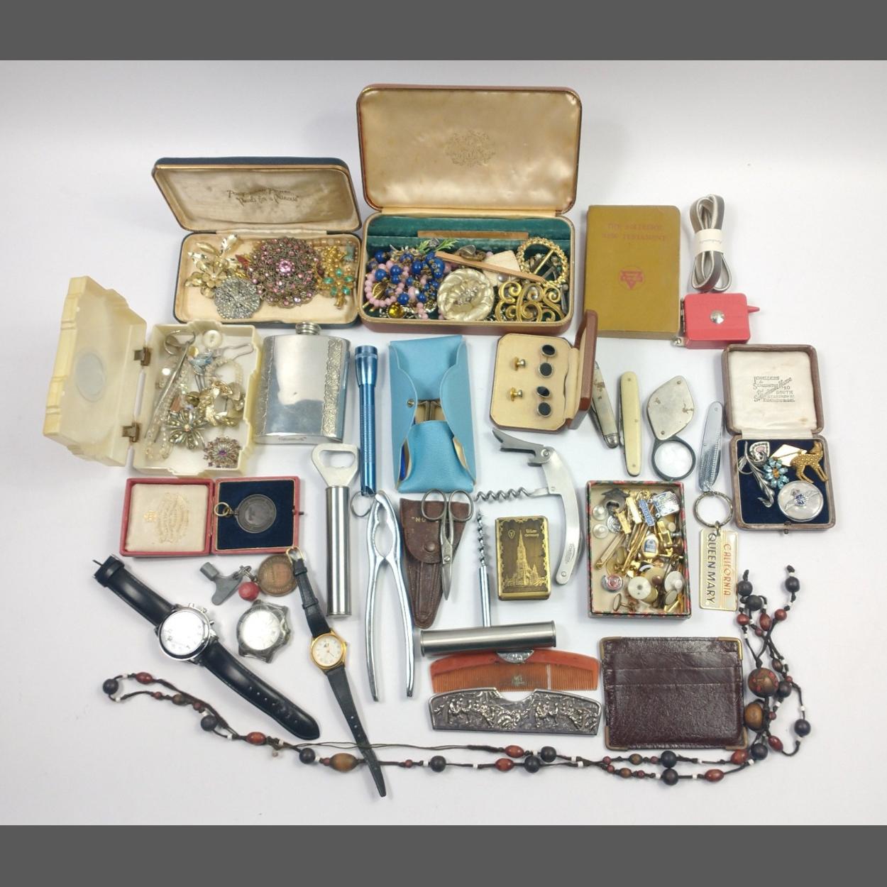 QUALITY LOT! A box of odds and ends to include vintage costume jewellery, a plastic Elizabeth R 1953 jewellery box with contents, various bottle openers, a Scottish Piper hipflask, watches etc
