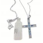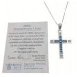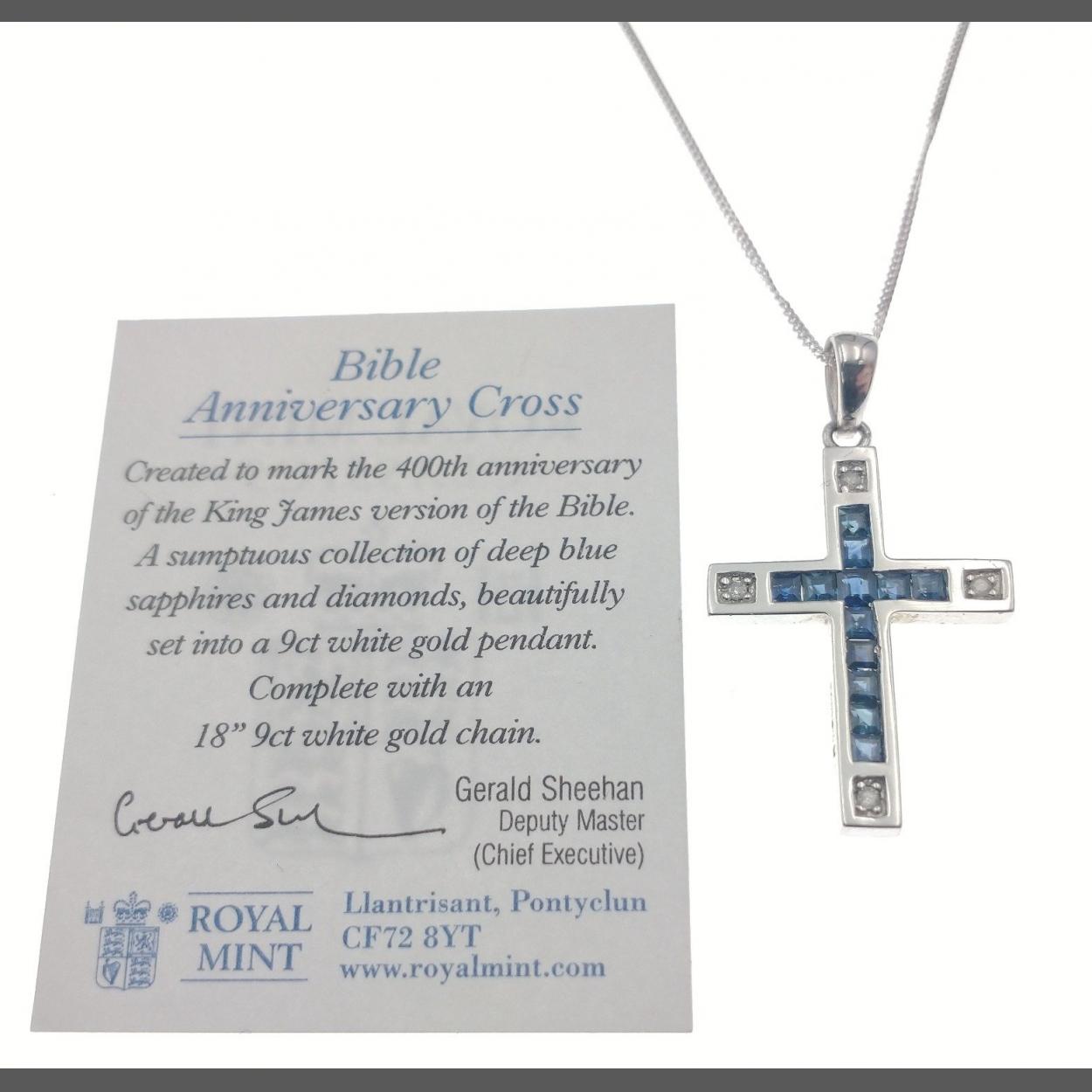 A ROYAL MINT Bible Anniversary Cross marking the 400th anniversary of King James version of the Bible in the form of a 9ct white gold pendant with sapphires and diamonds - with a 9ct white gold chain 4.2g approx - still within its original presentation box - retail £300!