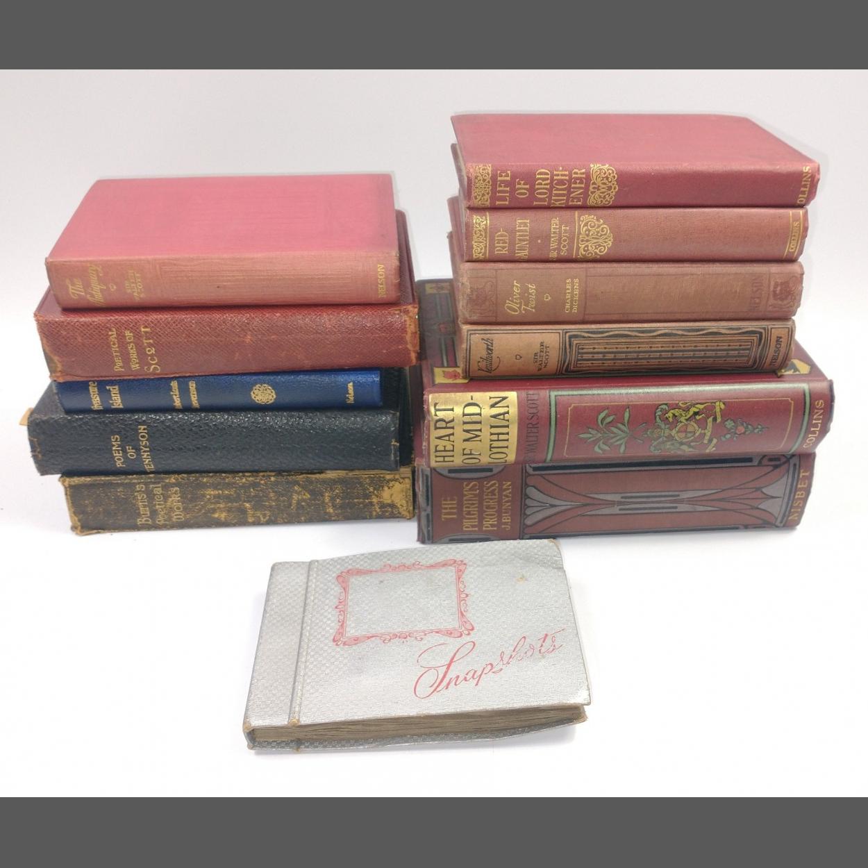 A selection of the classics including the Poems of Tennyson published by Henry Frowde/OUP in 1907, the Heart of Midlothian by Scott, illustrated by HE Butler with inscription to Nellie Buglass for Excellence in Commercial Arithmetic 1914-15, small hardback editions by Collins Clear Type Press and Nelson of Red-Gauntlet by Scott, Oliver Twist by Dickens, Treasure Island by Stevenson, The Life of Lord Kitchener by Hackwood etc plus a small photo album with snaps from around Scotland and Ireland in the 1950s