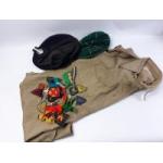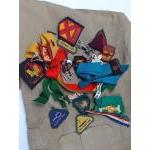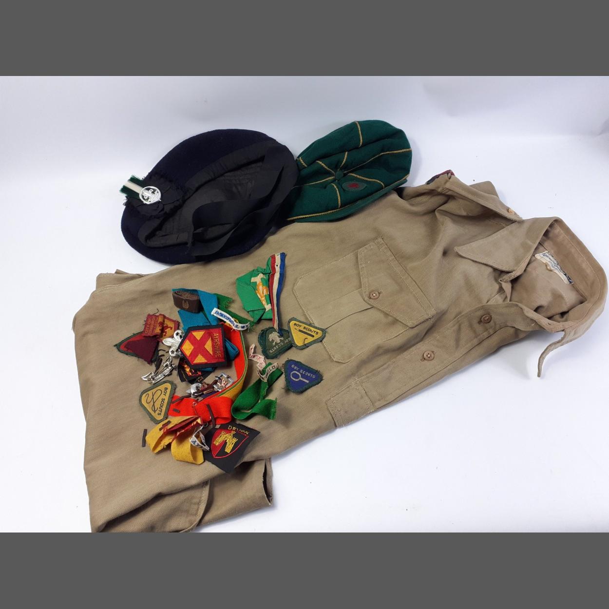 A vintage large size BOY SCOUT shirt with some badges and a shoulder badge for 5th PORTOBELLO , a cap E1147 THE WOLF CUB , an envelope full of cloth and metal badges relating to the BOY SCOUTS and a Scout Cap
