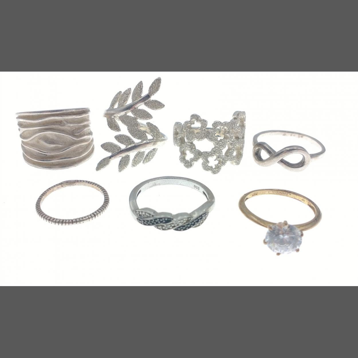 Five rings stamped 925 sized N, O, Q, R weight 15.2g, a ring stamped 925 with gilt finish and clear stone, size N, gross weight 2.1g and three white metal rings size J, L and N