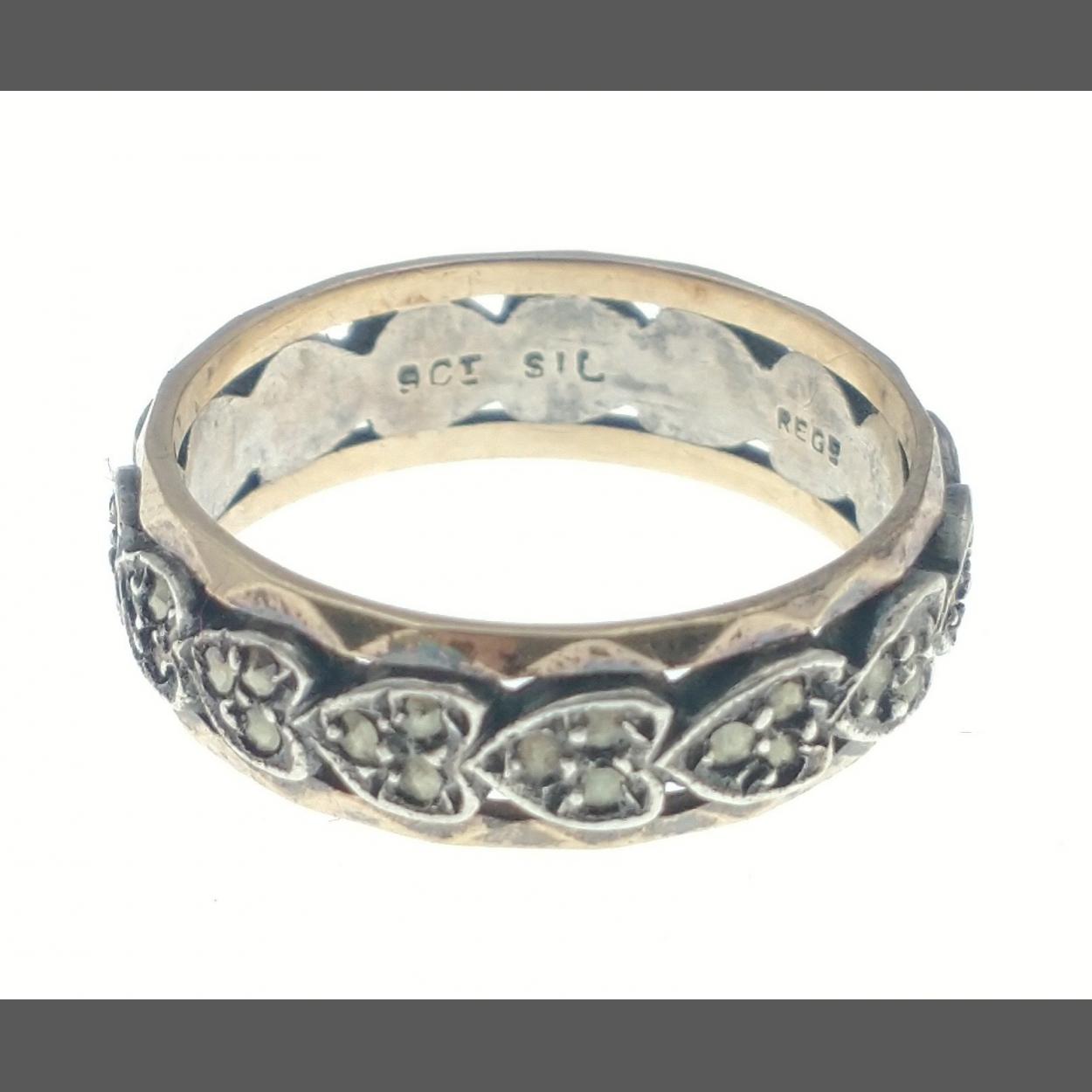 An unusual ring stamped both 9ct and silver - 9ct bands on outer rim, silver centre ring all set with marcasites in heart-shapes, size L, gross weight 2.82g
