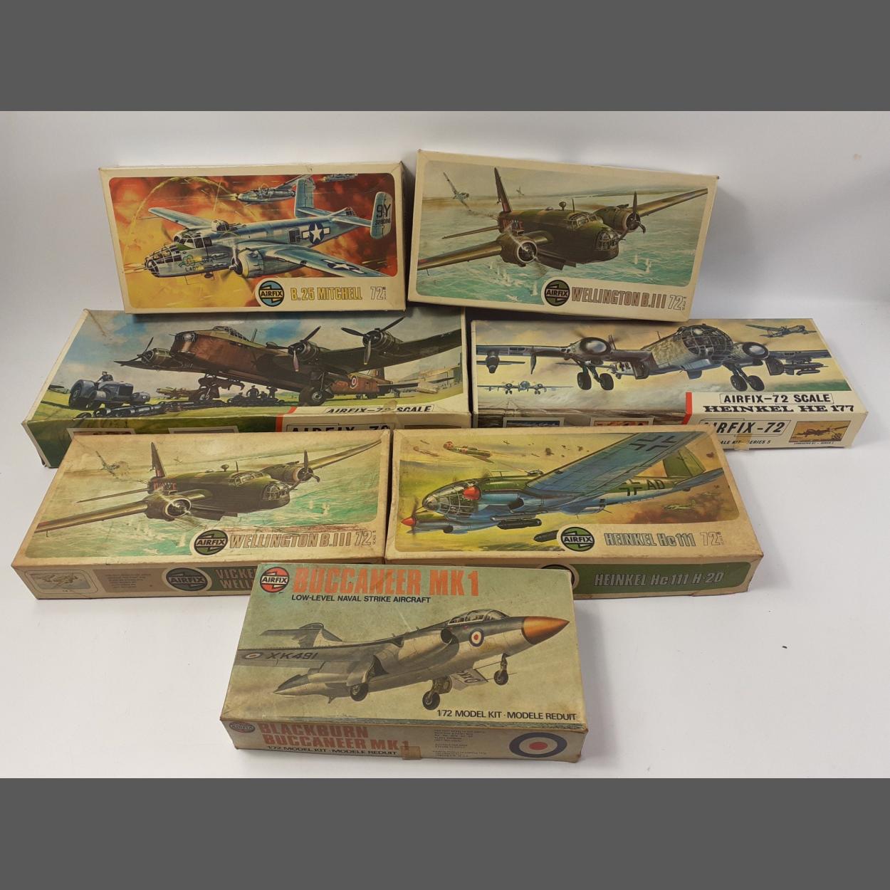AIRFIX 1/72 model Kits x 7 to include BUCCANEER, HEINKEL HE111, HEINKEL HE177, SHORT STIRLING, WELLINGTON, B25 MITCHELL, WELLINGTON 111. All 1970s kits in original boxes with wear from storage. All unbuilt and appear complete.