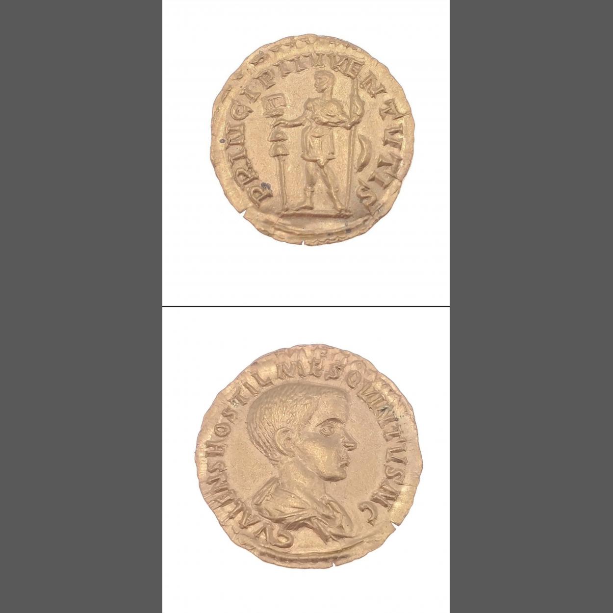 ANCIENT ROMAN GOLD COIN - AV AUREVS HOSTILIANVS CAIVS VALENS - 251 AD weight 3.59g approx - diameter 1.8mm approx - this coin was part of an avid coin collectors collection - there is no documentation with this coin. Hostilian was briefly Emperor in 251AD before dying of plague whilst still a teenager
