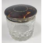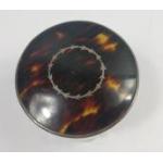 A small dressing table pot standing 7cm high dia 6cm with tortoiseshell lid with silver hallmarked collar (Birmingham 1923)