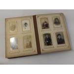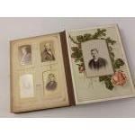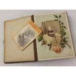 A VICTORIAN family cabinet photograph album from 1880s some with North East England photographers details on CDV rears. (Blyth, Gateshead). Mixed lot of portraits, album itself in fairly poor worn condition