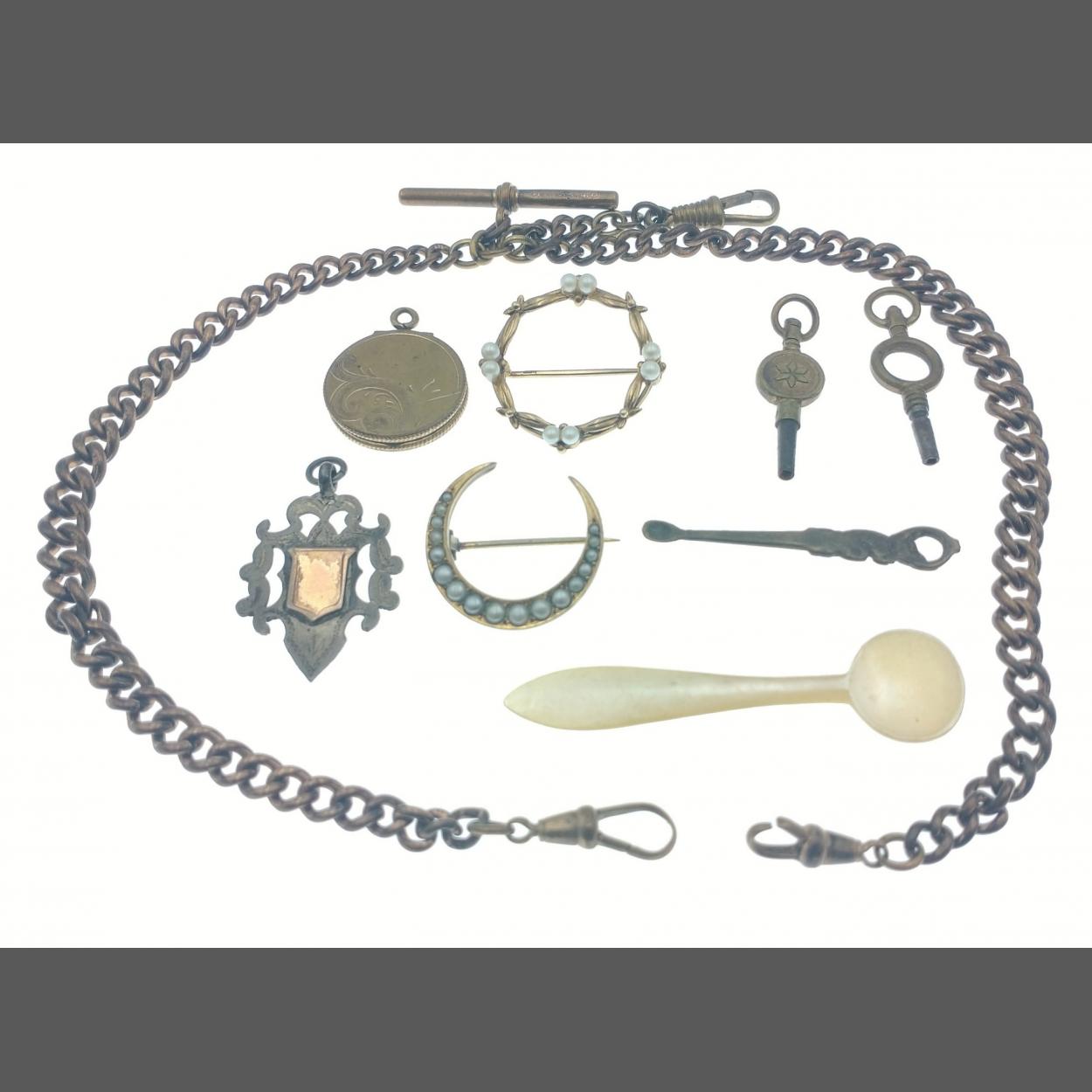A lovely little collection of intriguing items to include a snuff spoon, a mother of Pearl mustard spoon, two Victorian watch keys, a rolled gold Albert watch chain with graduated links, a small silver shield fob, an engraved locket and two rather lovely unmarked gilt coloured seed pearl brooches in good condition.