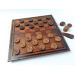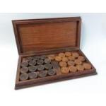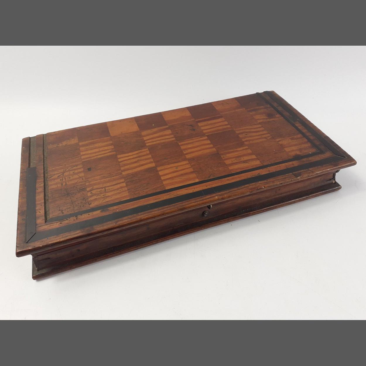 A lovely antique folding wooden inlaid DRAUGHTS BOARD / BOX with fifteen white and fifteen black counters. There are a few areas where the dark wood inlay strips are missing but overall the condition is good. A really attractive and interesting piece.