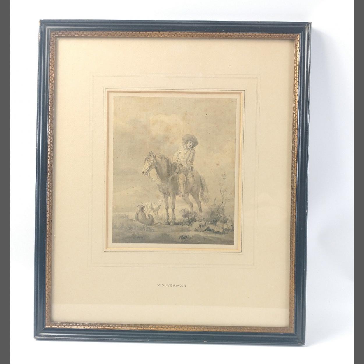 After WOUVERMAN - an artwork of unknown media with some foxing of a man on horseback with 2 dogs, frame measures 42x36cm, visible work 19.5x16cm