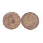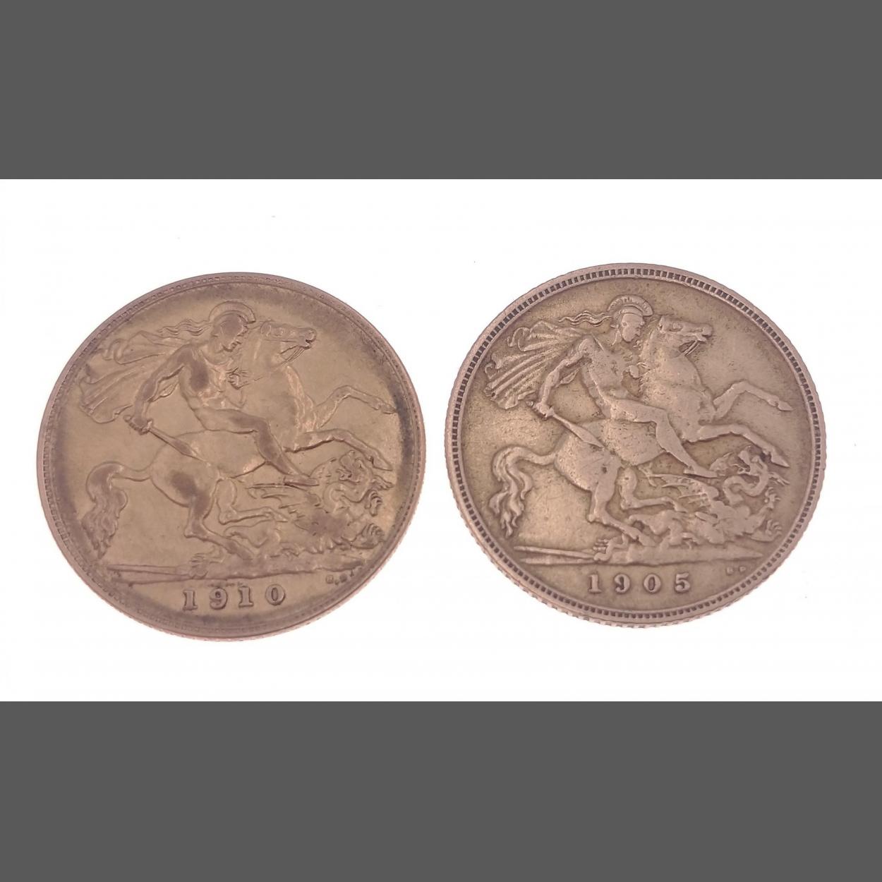 TWO HALF 22ct Gold Sovereigns EDWARD Vll 1910 weight 3.9g approx and 1905 weight 3.9g approx in good condition weight 3.9g approx