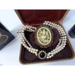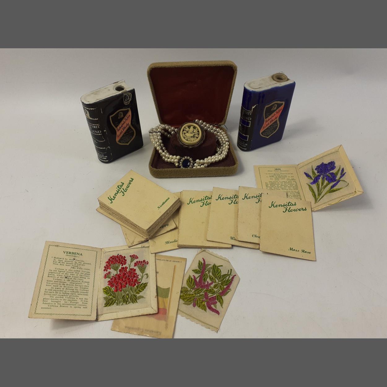 A small mixed lot comprising of vintage KENSITAS silk flower cards, faux pearls with a central SILVER mount, a brooch and two small empty Rutherfords Whisky decanters