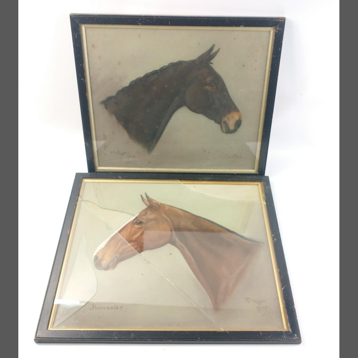 Two FASCINATING studies of horses' heads from 1934 and 1935 by E PROSSER signed by the artist, frame size 43x37cm ('Scottie 1934') and 47x42cm ('Harvester1935'), glass broken on latter picture