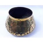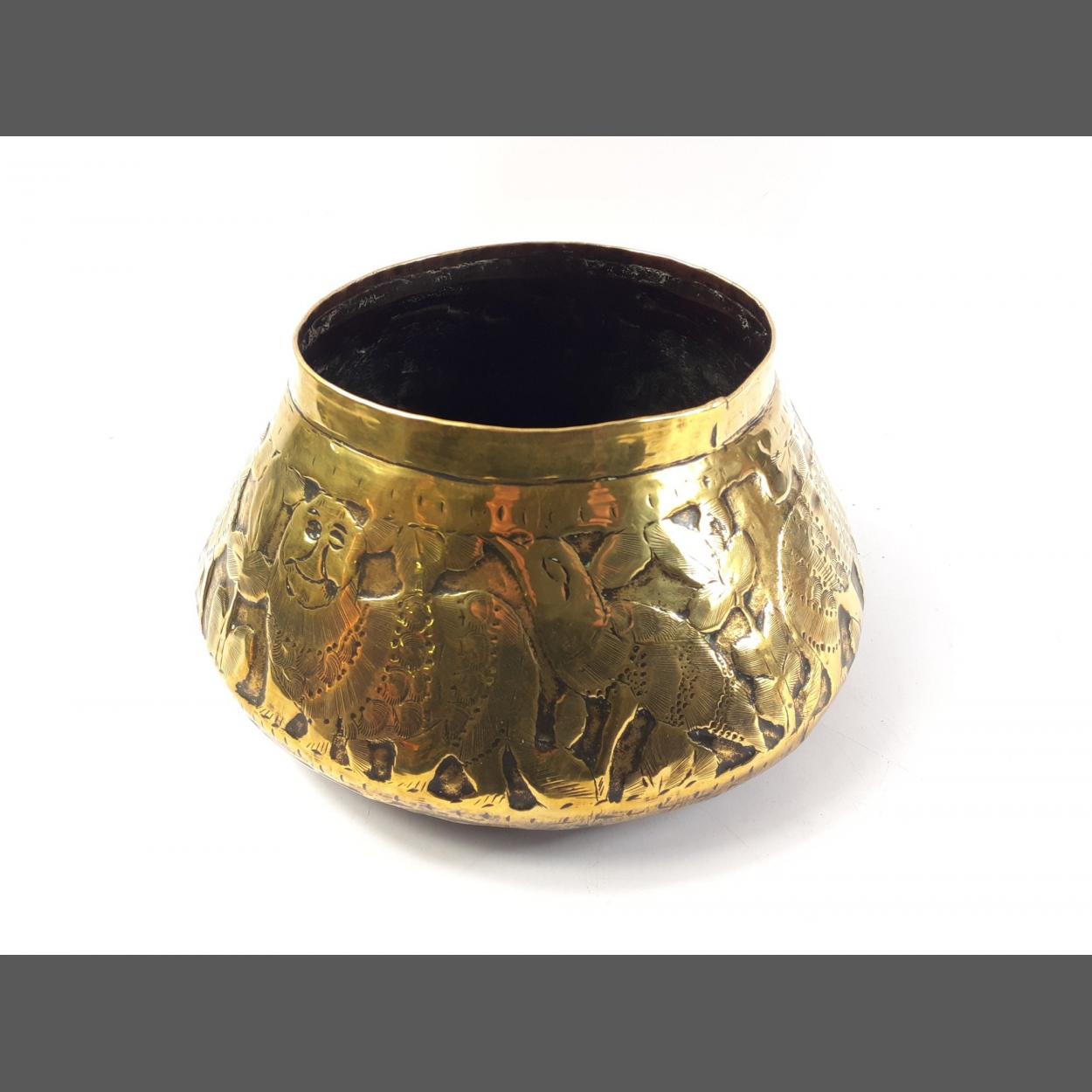An ANTIQUE African brass spitoon now suitable as a fabulous plant or pot pourri holder - it has repousse designs depicting flora and fauna with jungle style planting and with tigers, elephants and wild birds etc