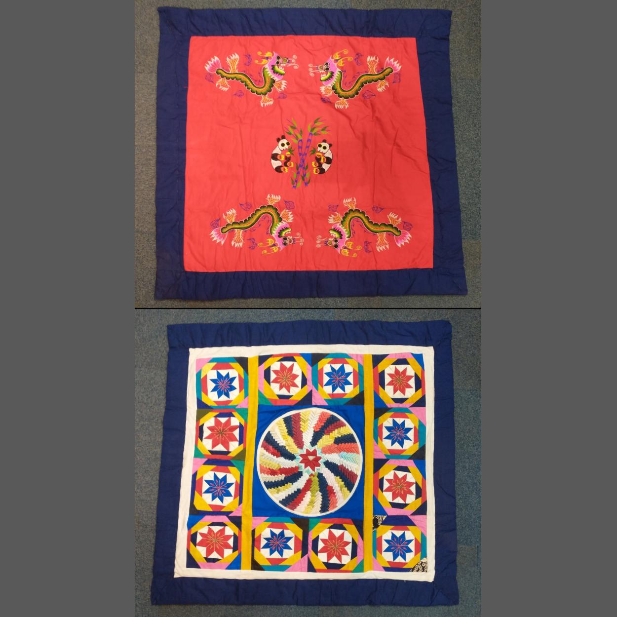 An interesting quilt measuring 93x90cm approx, one side depicting embroidered Chinese dragons and pandas, the other made up of geometric shapes, a bright and cheerful addition to the home