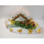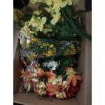 A large box of silk flowers suitable for every season of the year including everlasting poinsettias and a tub of pine cones plus a Christmas candle bridge
