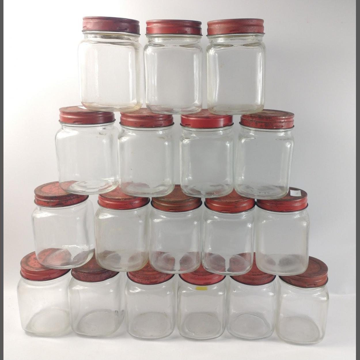 Eighteen vintage glass storage jars each with red metal lids, great kitchen storage, all the jars have squared edges so will fit compactly on kitchen shelves stands approx 16cm high lid diameter 10cm