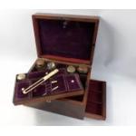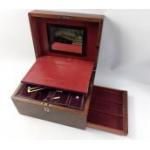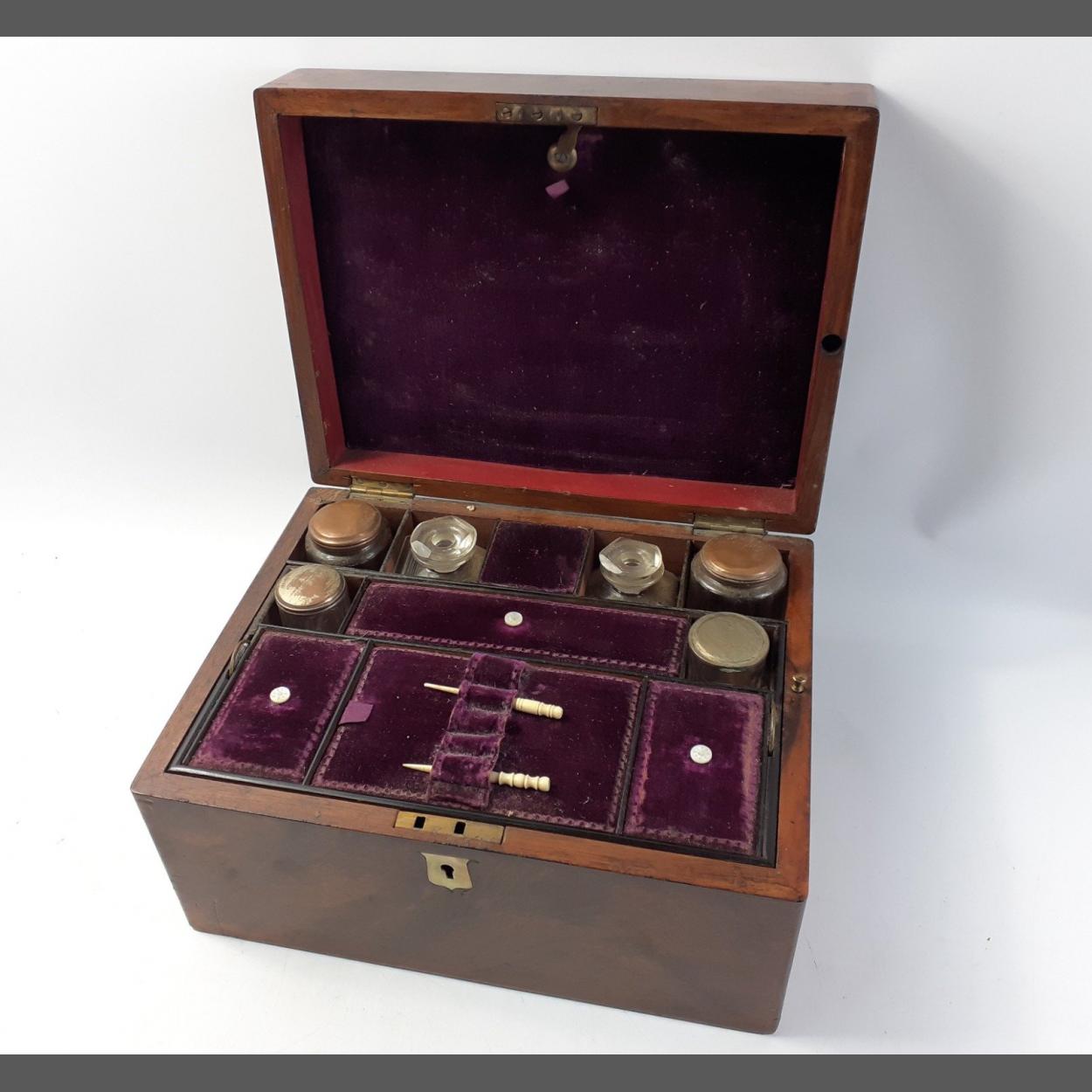 A wooden ladies dressing table box with purple velvet lining, mirror in lid, 6 glass bottles intact and hidden drawer, measures 30x23x17cm approx