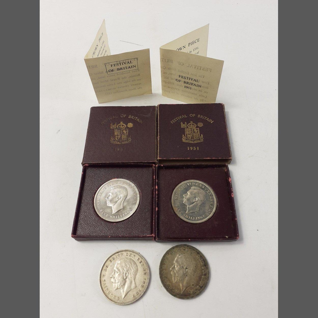 Two boxed 1951 Festival of Britain Crowns with leaflets and two 1935 Hobby Horse Crowns. Boxed 1951 coins are excellent, the 1935 coins have wear and heavy toning