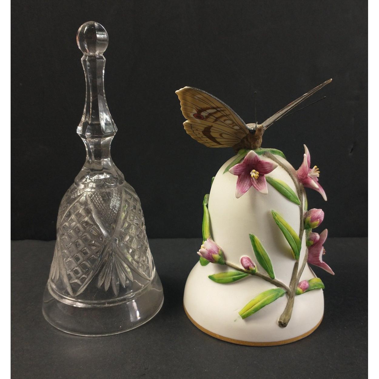 Two small decorative bells a glass one and a ceramic one topped with a BUTTERFLY but sadly with some minor damage to the flowers
