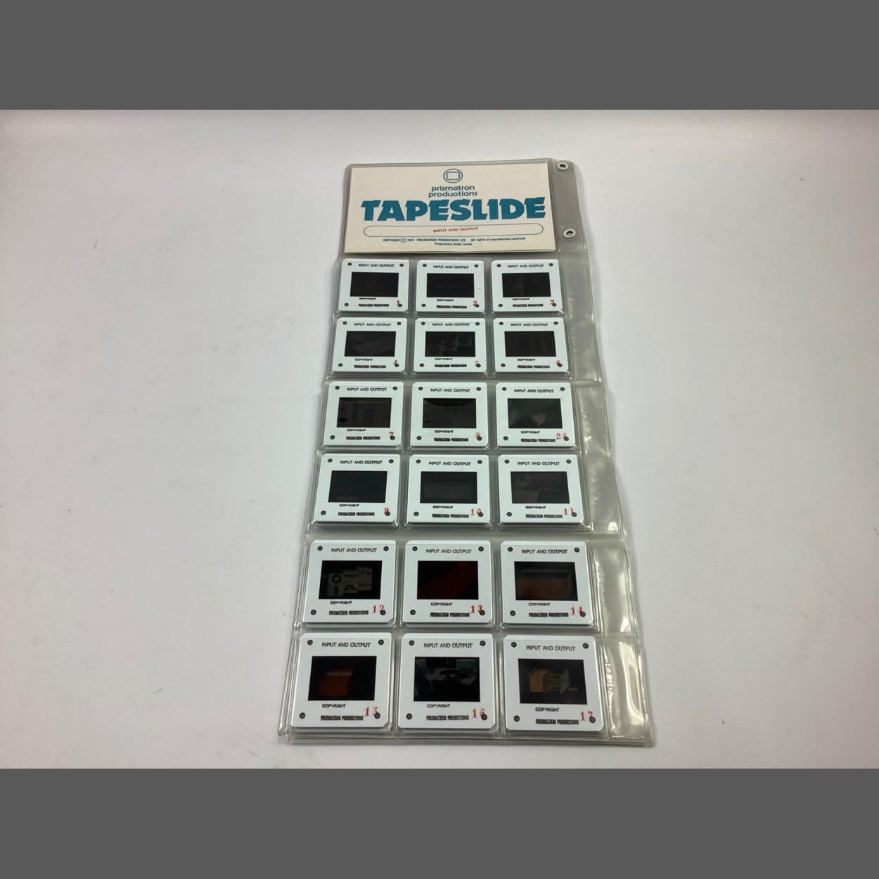 For aficionados of computer history a complete set of 54 slides of input and output using old computers , produced by Prismatron Productions TAPESLIDE with accompanying cassette tape