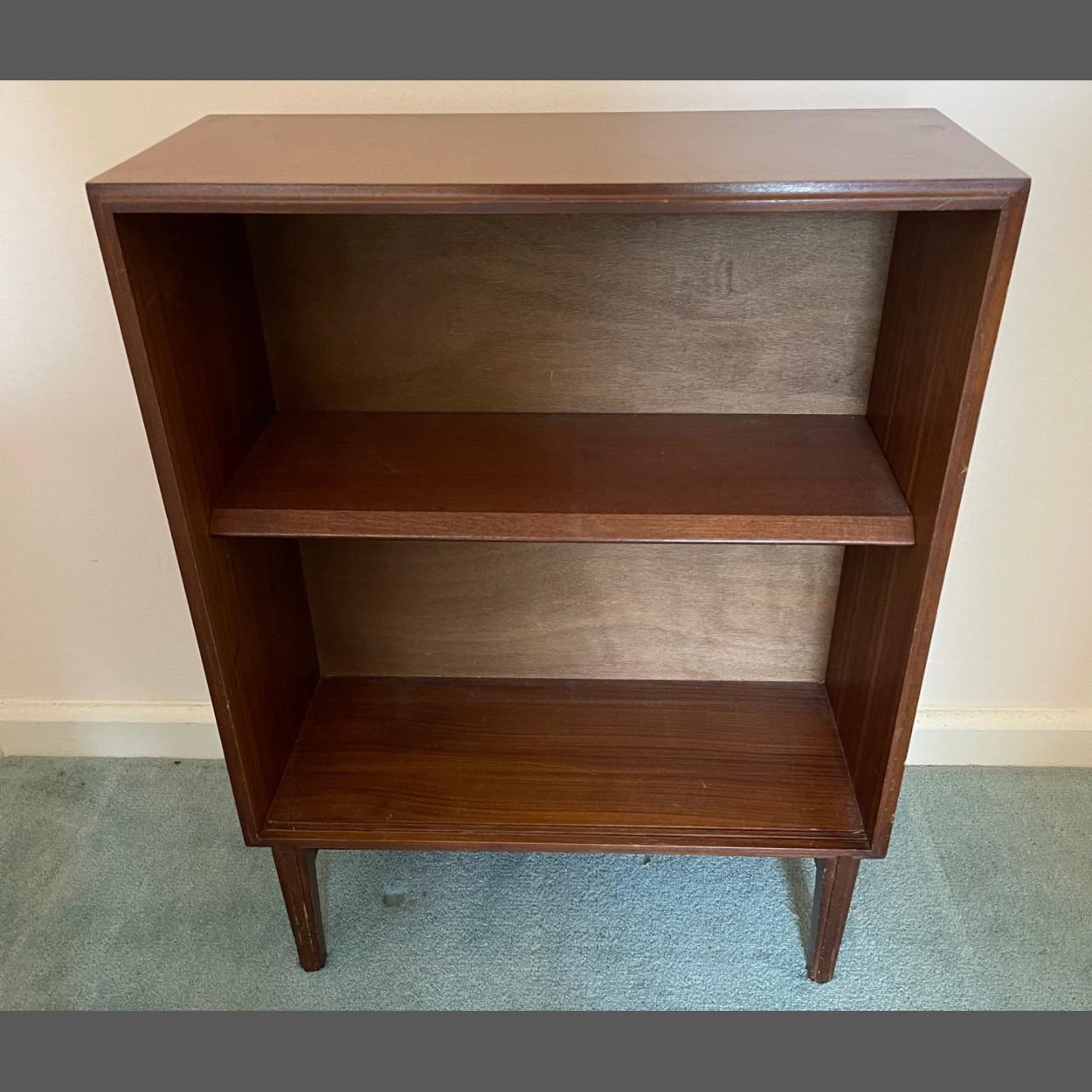 A handy small two shelf retro floor bookcase supported on four tapered legs - dimensions 75cm height x 65cm width x 25cm depth