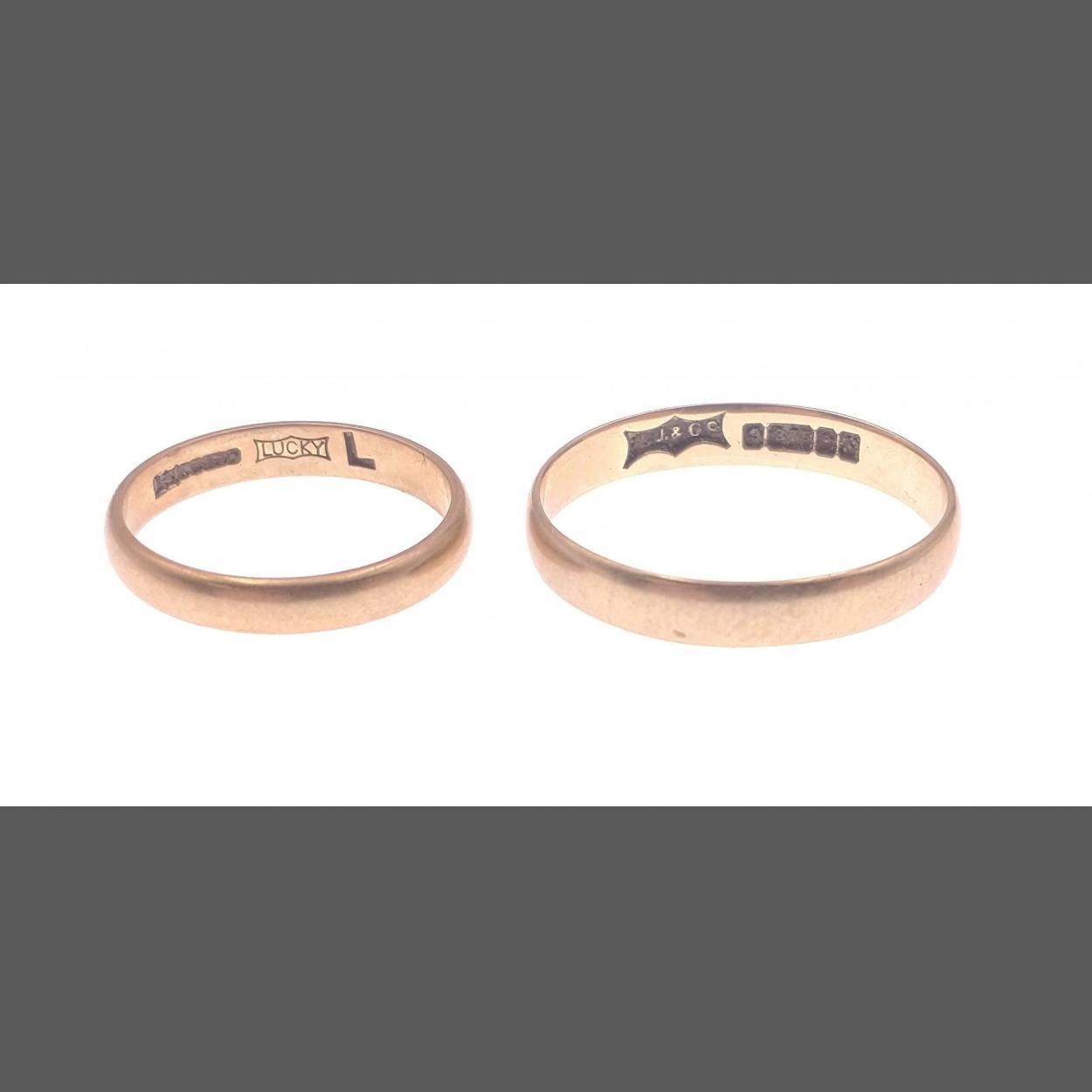 Two 375 stamped and Hallmarked yellow gold wedding bands weight combined 3.66g approx, ring sizes L and S