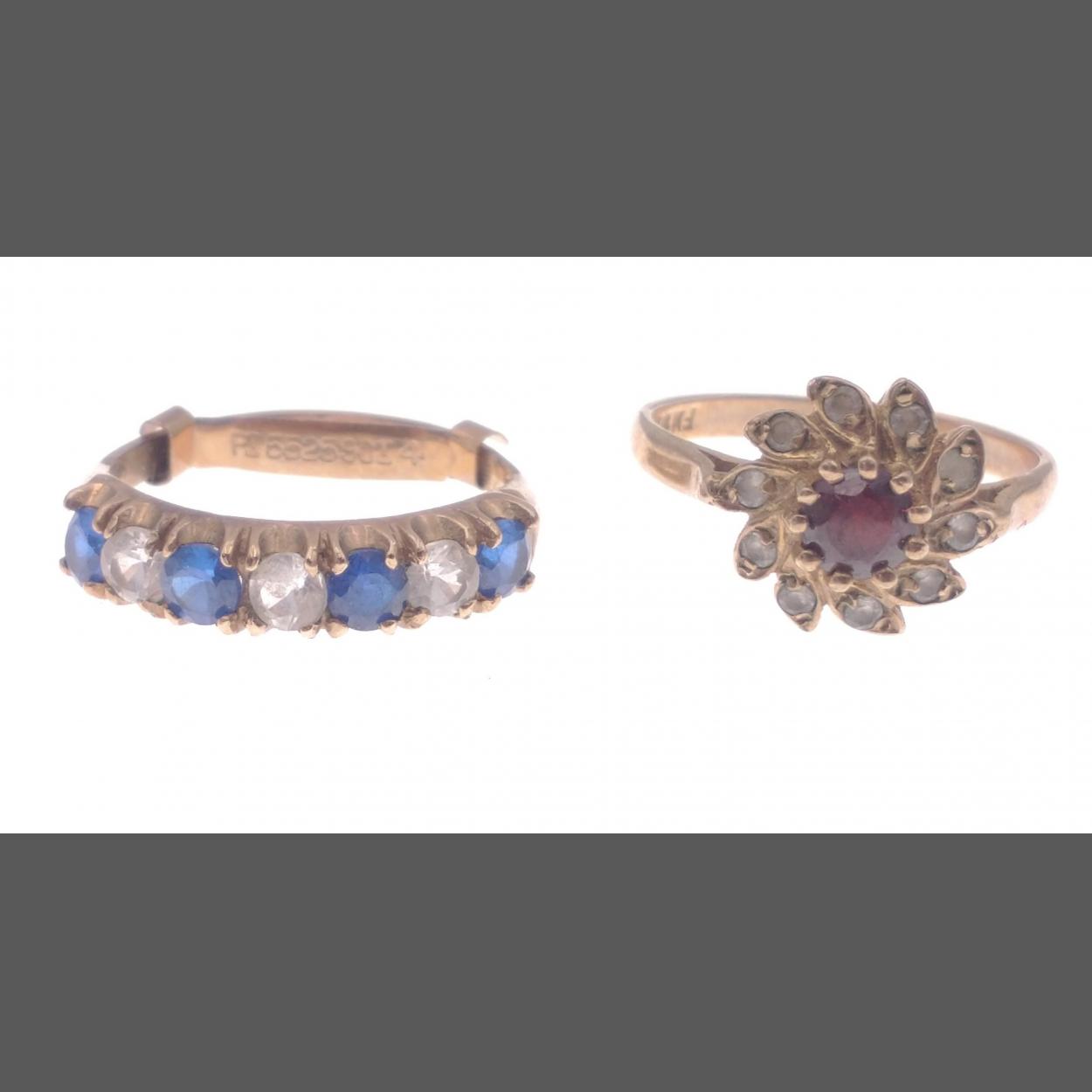 A 375 stamped ring with blue and white paste stones gross weight 2.175g approx and also a 375 stamped yellow gold ring with a red ruby centred and small white stones surrounding the ruby ring size L gross weight 2.32g approx