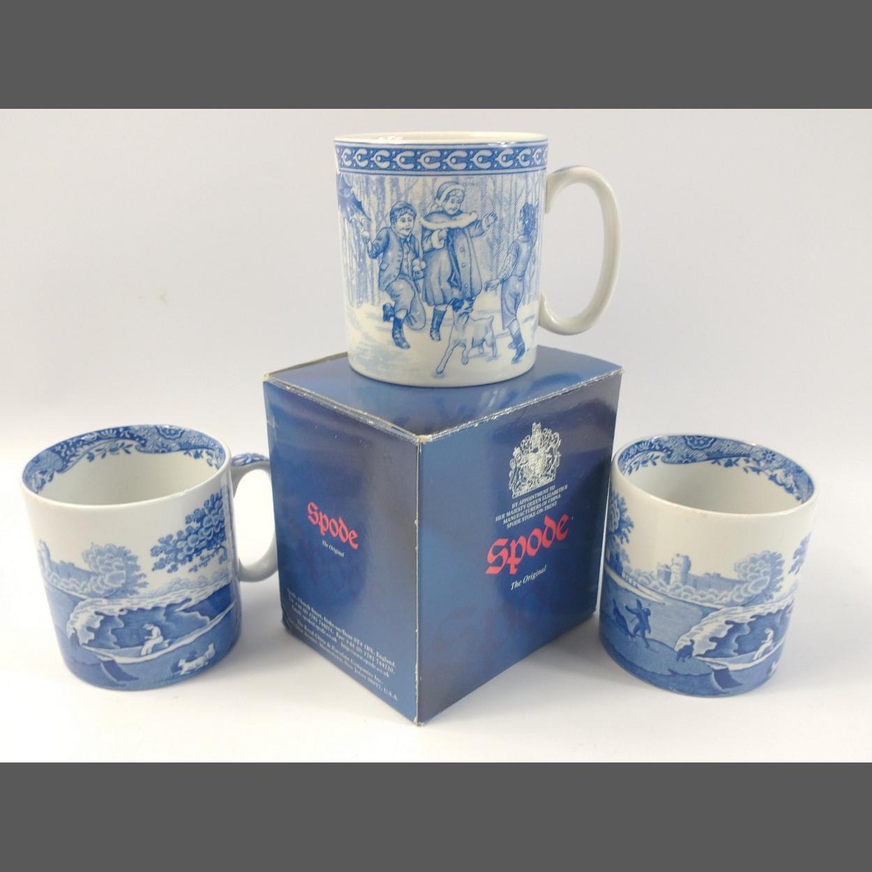 A boxed SPODE Victorian child mug collection - 'Snowball Games' plus 2 other Spode blue and white mugs