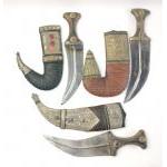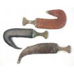 Three vintage Yemeni jambiya daggers with leather sheaths decorated with Middle Eastern silver and stones. Largest measures 42cm long approx