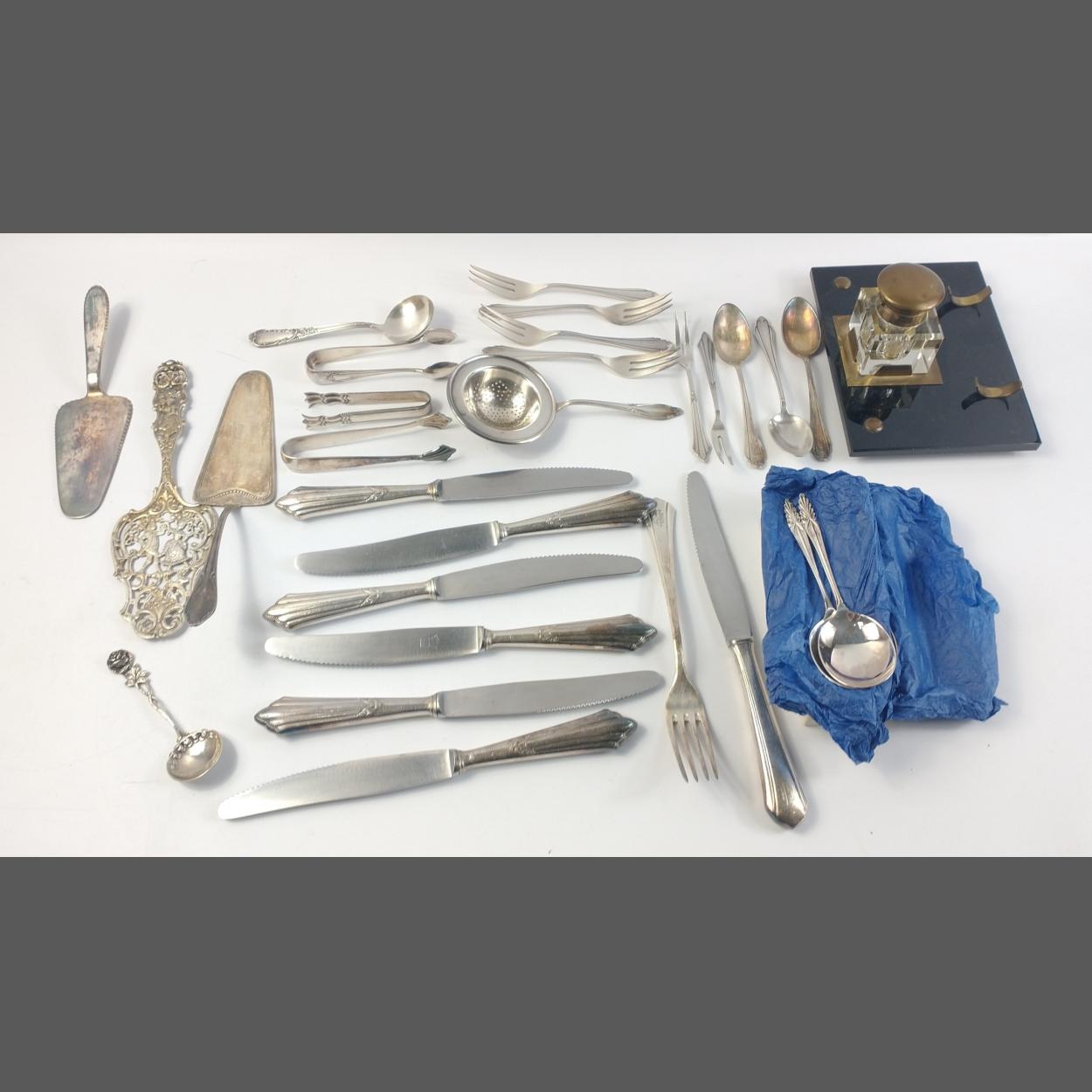 An interesting mixed lot to include a vintage desk inkwell on black slate stand, a box containing six plated spoons, some Martin 90 flatware, plated tea strainer, cake slices, three nice condition pairs of sugar nips and and elaborate 800 silver German cake slice and a rose finial 800 silver tea spoon. An interesting and useful lot.