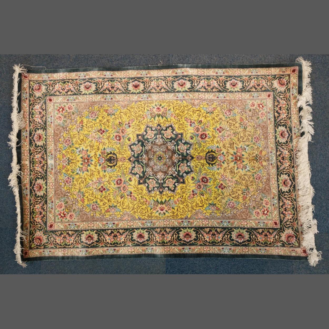 A silky Middle Eastern rug approx 78x120cm in trendy shades of grey and yellow, can be used as a wall-hanging. Please note that the photographed colour is very different from in-person so viewing is advised
