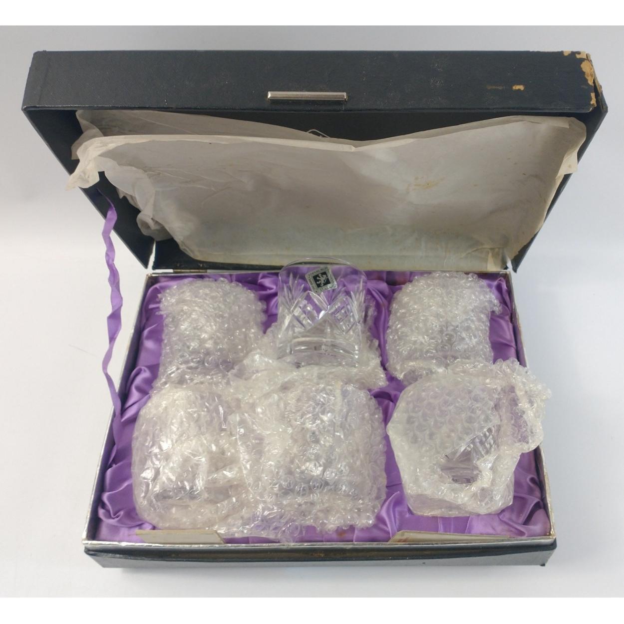 EDINBURGH CRYSTAL mid size whisky tumblers in original box, still with labels attached. Box with wear but glasses are in excellent order. Each tumbler stands 76mm tall.