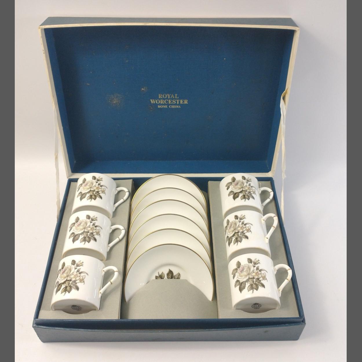ROYAL WORCESTER Bone China Demitasse coffee set in original case. White Rose pattern and nice gilt accents. All in good useable condition.