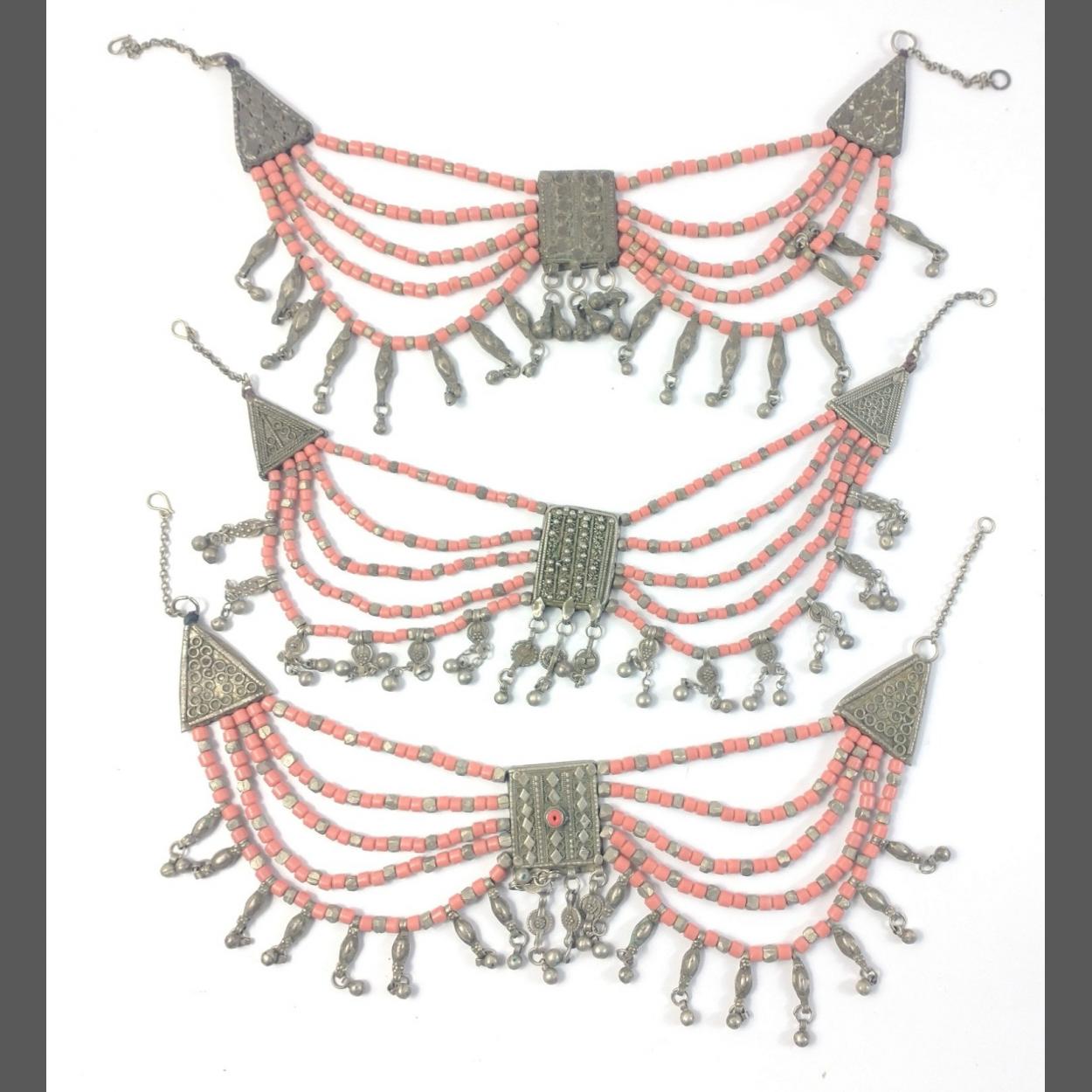 Three substantial Middle Eastern coral coloured and white metal multi strand necklaces in good condition. Each measures approx 35cm across and is in good order with working catches