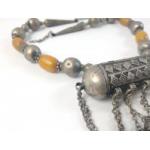 Middle Eastern faux amber and white metal necklace with barrel style pendant and attached bells. Another impressive looking piece. Measures 54cm across excluding the catch and weighs 195g gross approx.